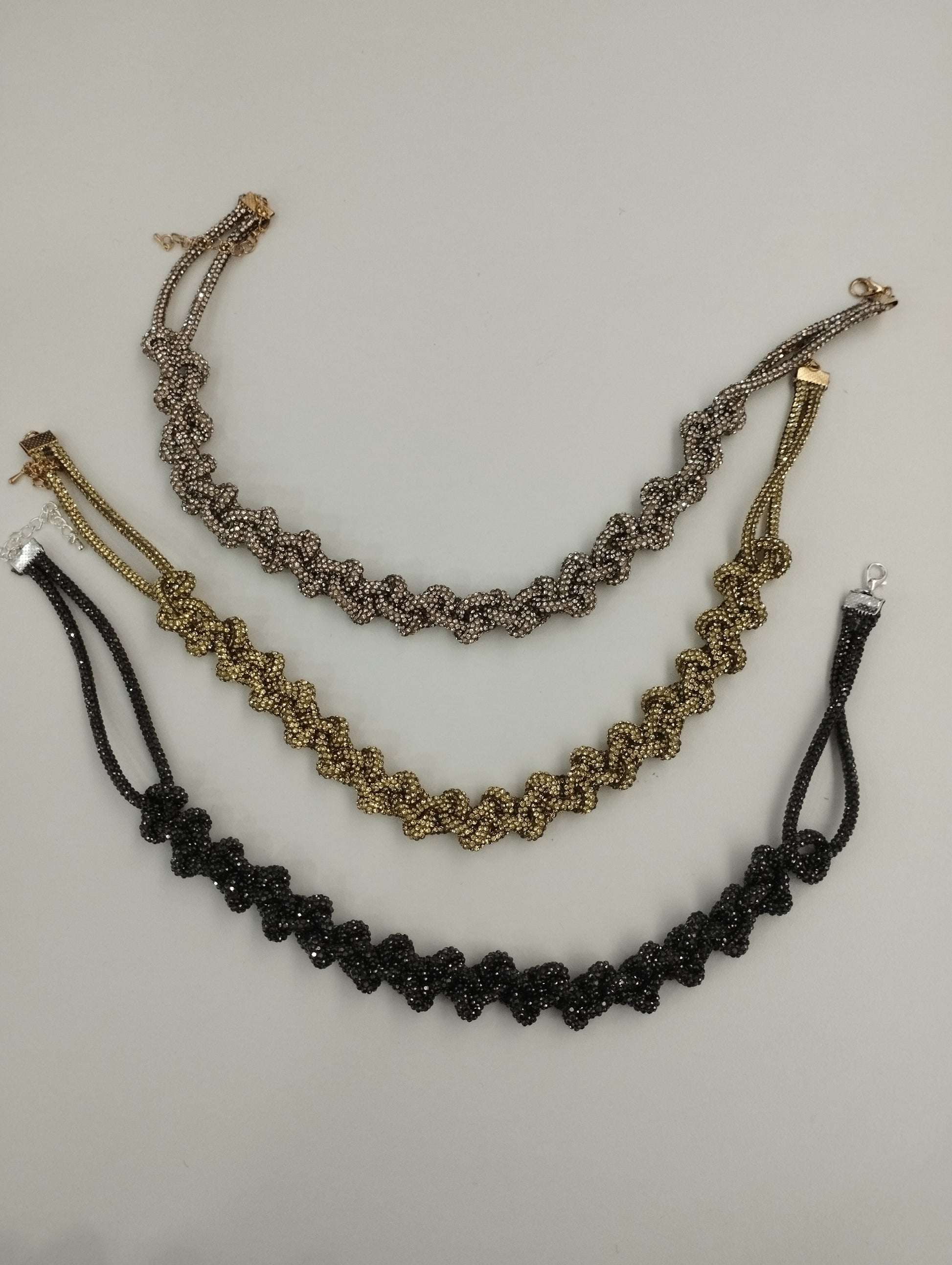 Aggiungi un tocco di eleganza con questo choker artigianale intrecciato a mano, realizzato con filato strass che crea un effetto luminoso e tridimensionale.