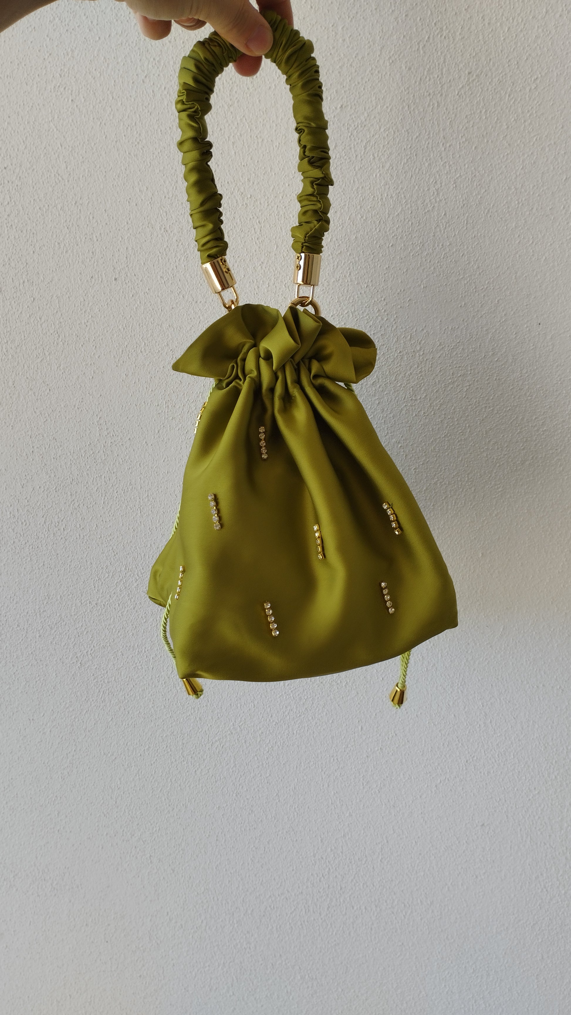Borsa a sacchetto in satin di seta con base e diamantini applicati "a pioggia", modello Bucket Bag