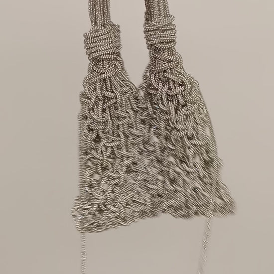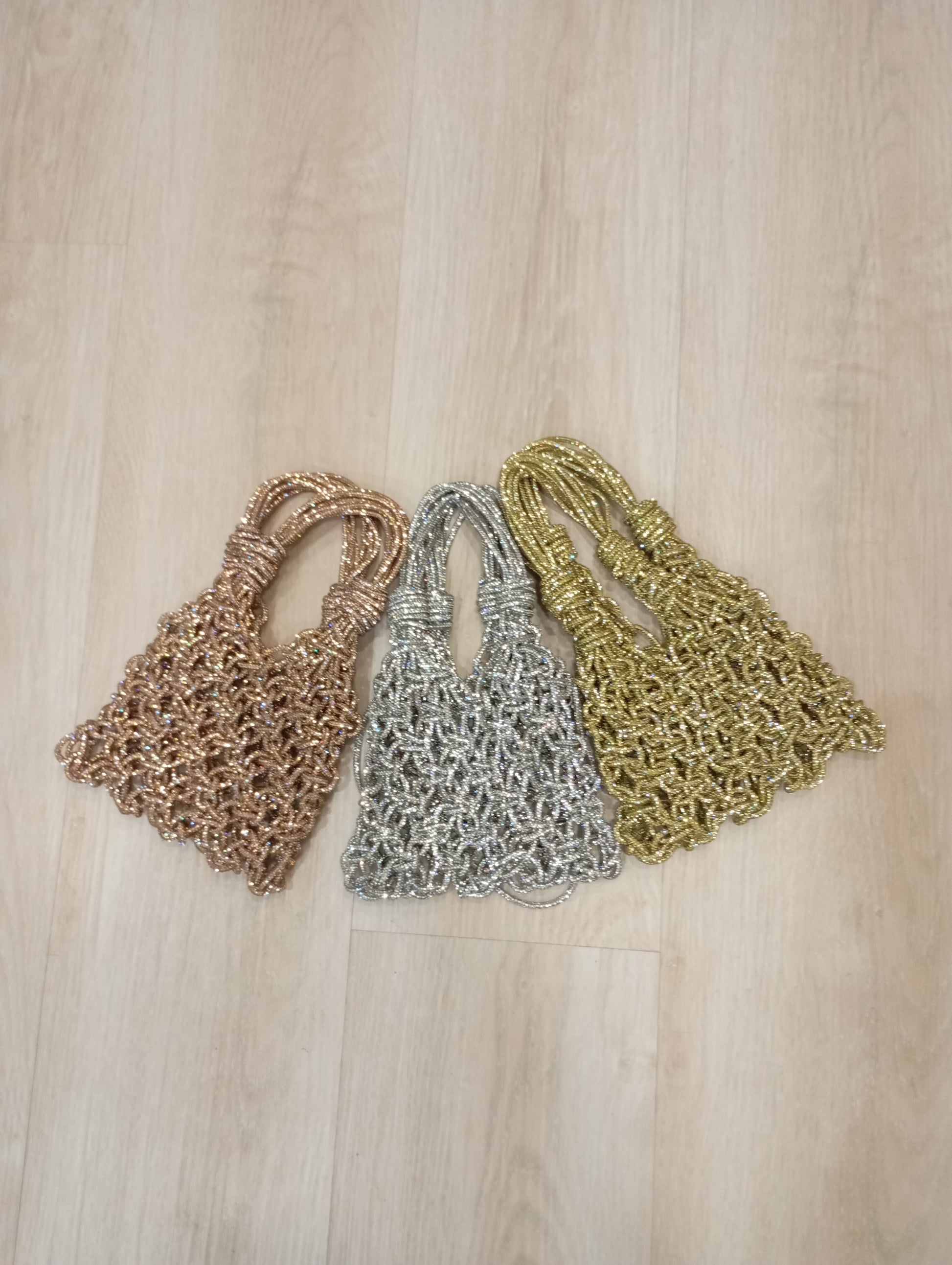 Borsa realizzata a mano con filato Crystal, luminosa e raffinata.